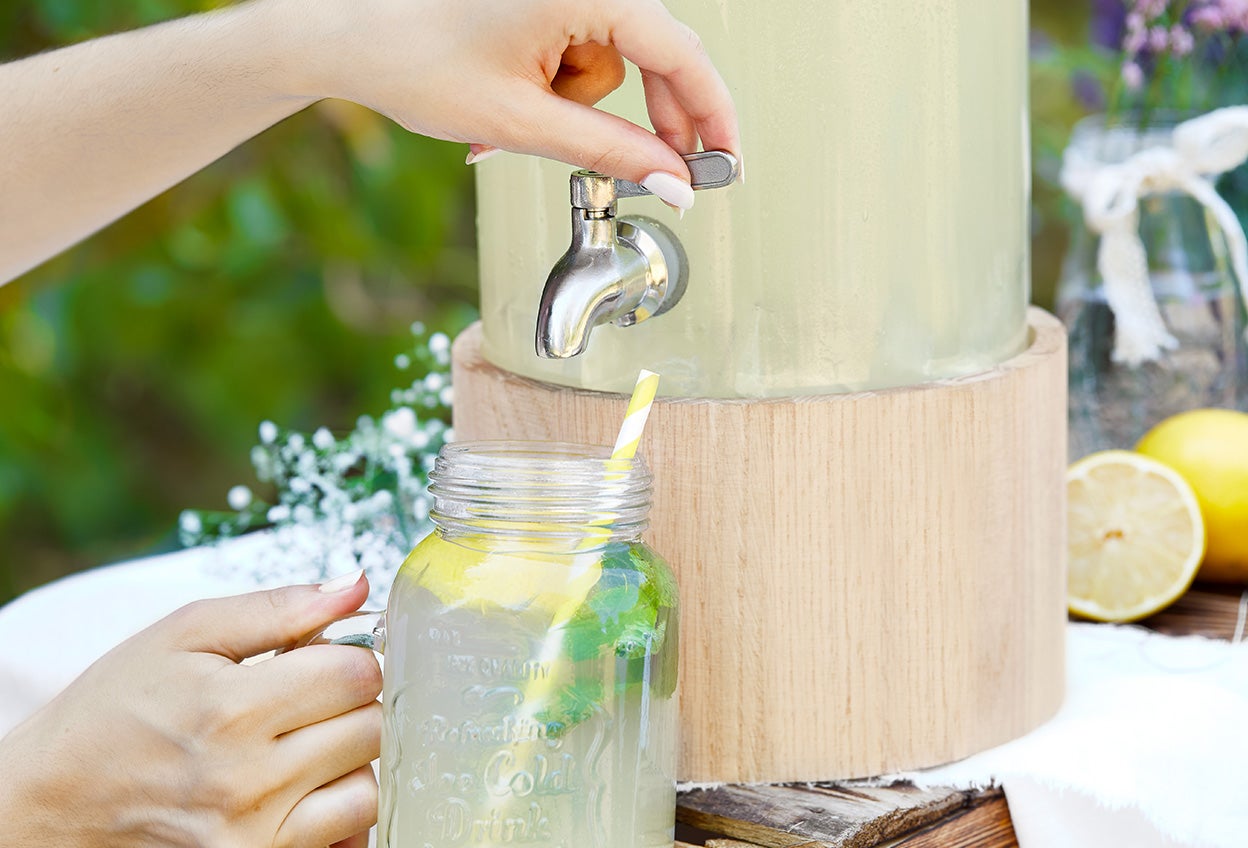 Greta – Glass drink dispenser 5 l with tap and wooden stand